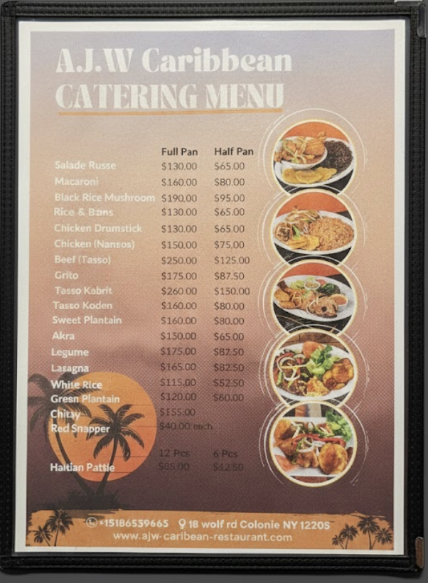 A. J. W Caribbean Restaurant was born from a simple idea: bring the real taste of Haiti and the Caribbean to the Capital Region. We marinate our meats overnight, cook our sauces from scratch, and serve big portions just like at home.